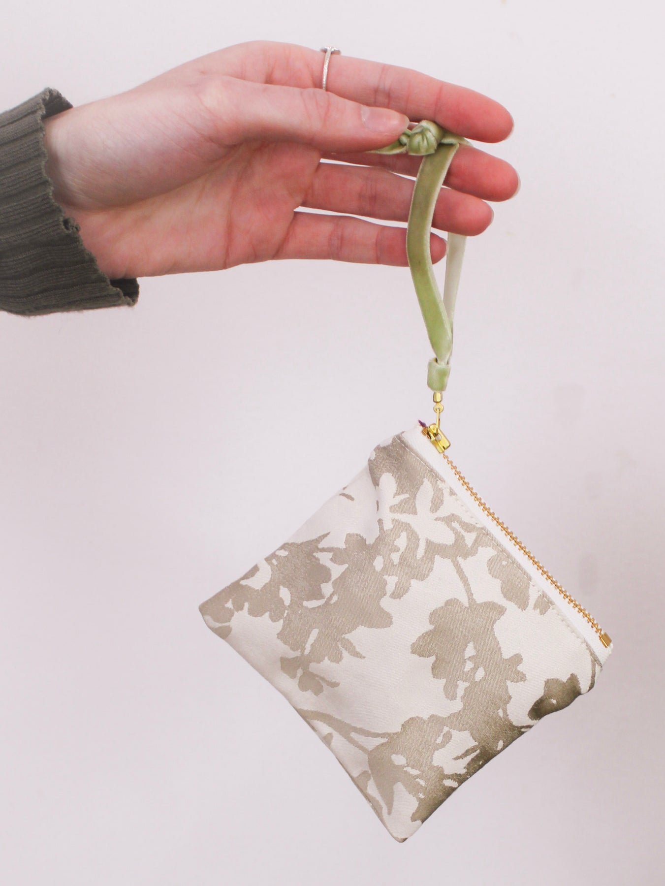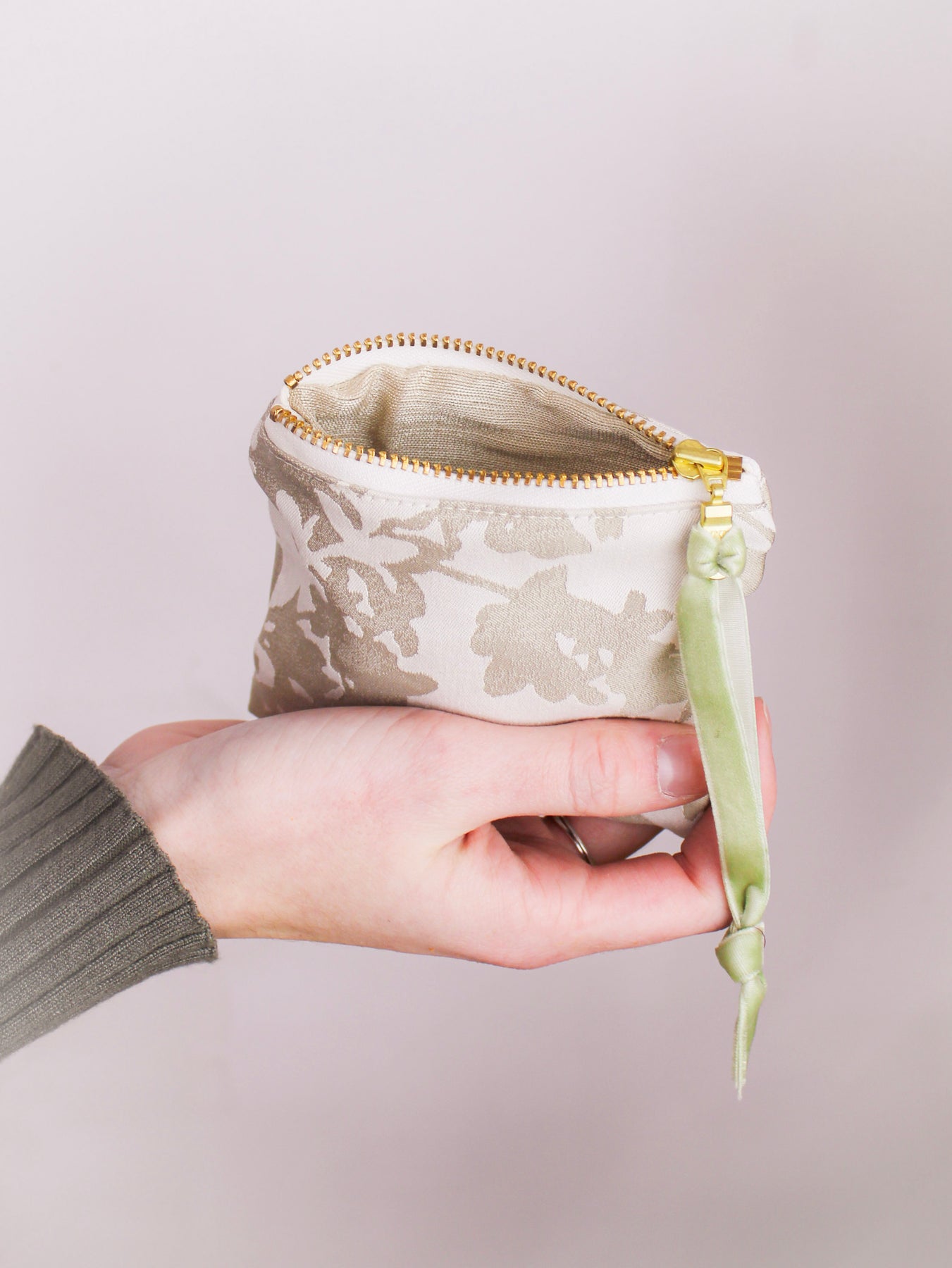This mini zip pouch, handmade in USA with a designer salvage upholstery fabric.