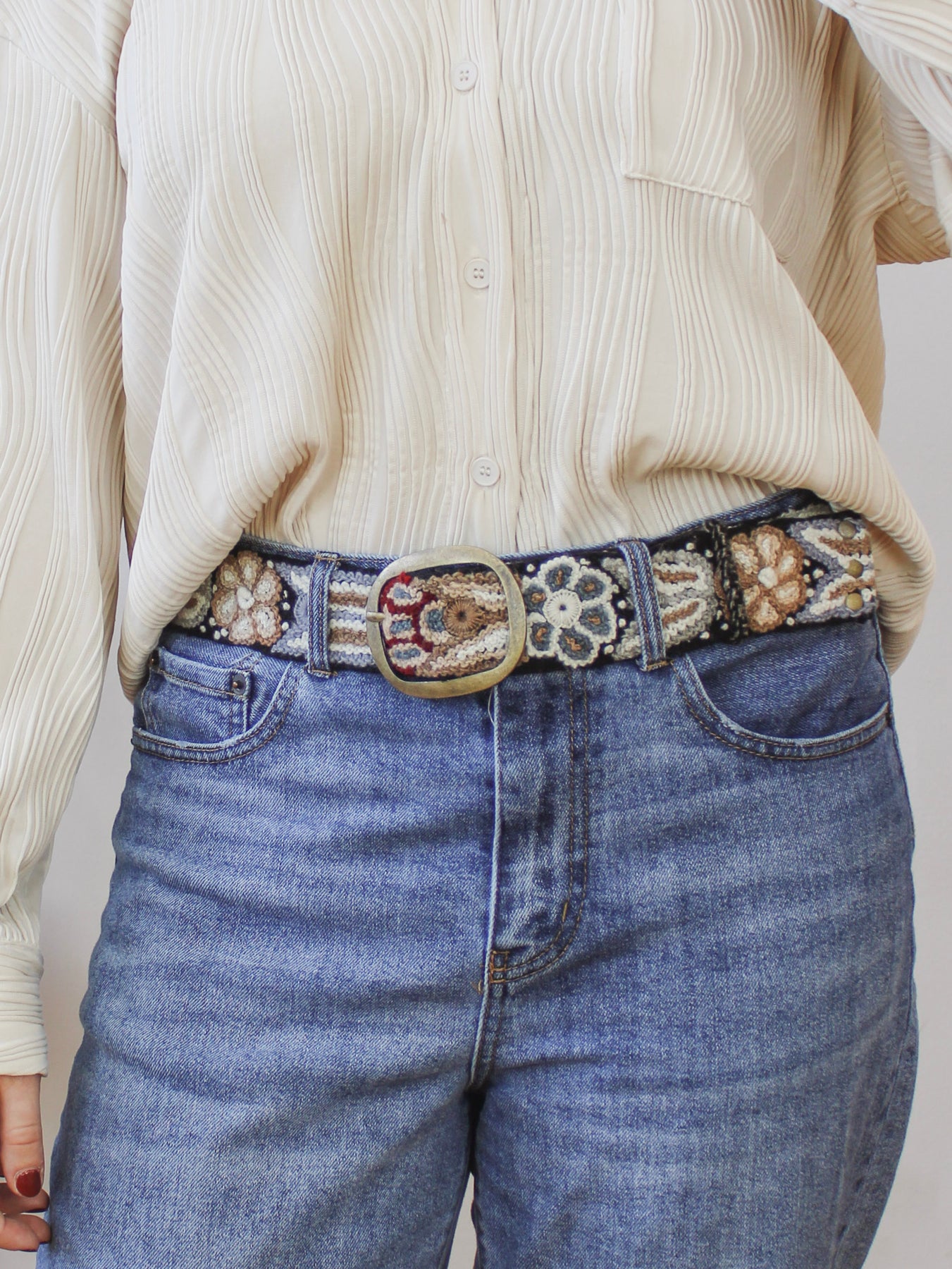 This hand loomed wool belt is truly a work of wearable art, produced over many hours with intricate hand embroidery. We love the sophisticated neutral color palette combined with the energetic floral patterns.