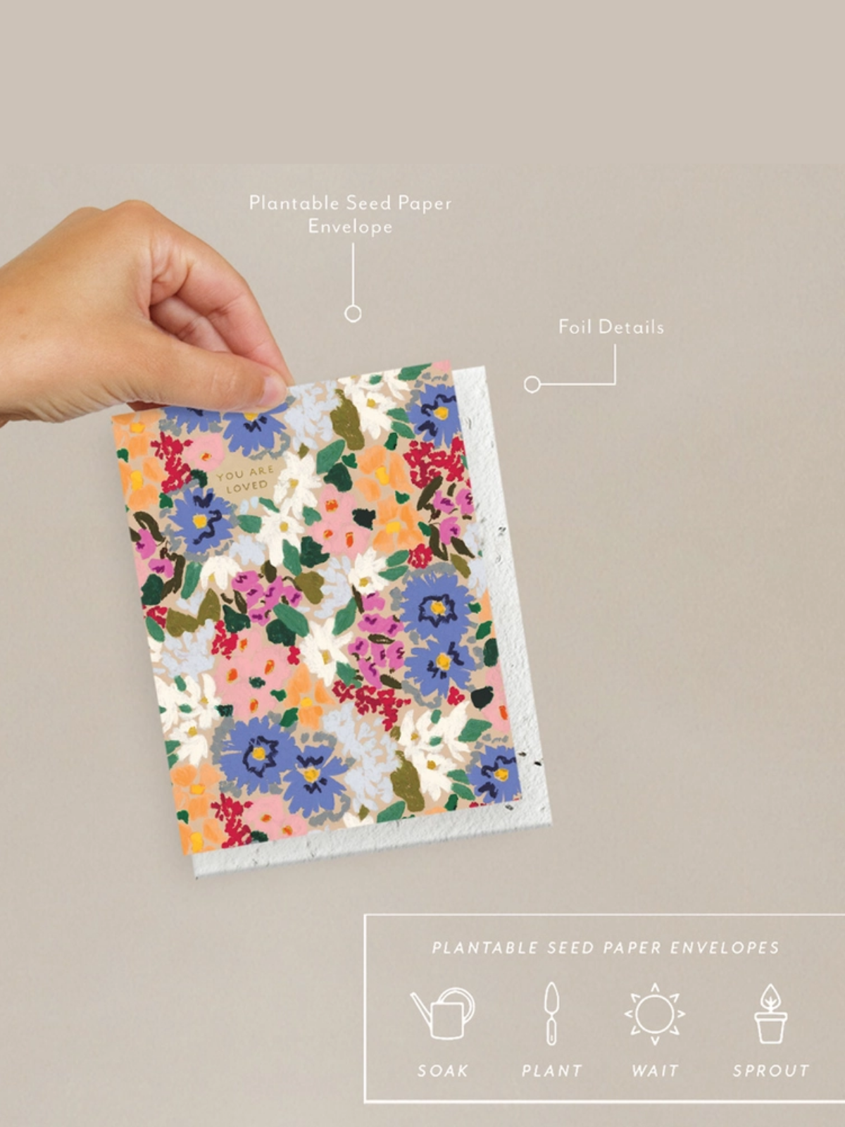 This is a special card with a built in little gift. All Seedlings greeting cards have a PLANTABLE seed paper envelope which is embedded with non-invasive wildflower seeds. This seed paper is made of a biodegradable eco-paper created with post-consumer materials - no trees harmed for this paper! When planted, our envelopes compost away leaving only flowers behind. Blank inside, these cards are printed on premium paper and are all accented with foil details.