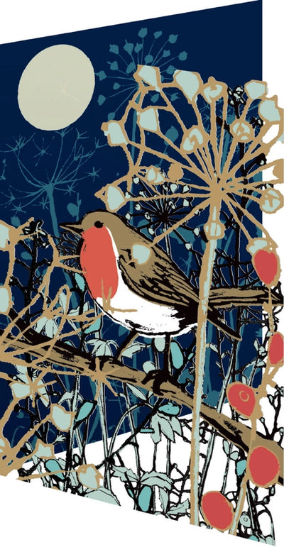 This woodland card celebrates the beauty of winter with a robin on branches against a bold bright moon. It can be used for any winter occasion. The laser stenciling makes it look like the plants are drifting off the page. The front of these cards could be pretty decorations in a window or anywhere the light can go through them.