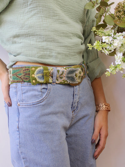 This hand loomed wool belt is truly a work of wearable art, produced over many hours with intricate hand embroidery. We love the sophisticated neutral color palette combined with the energetic floral patterns.