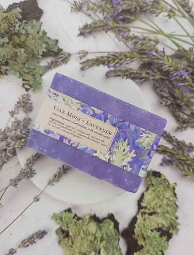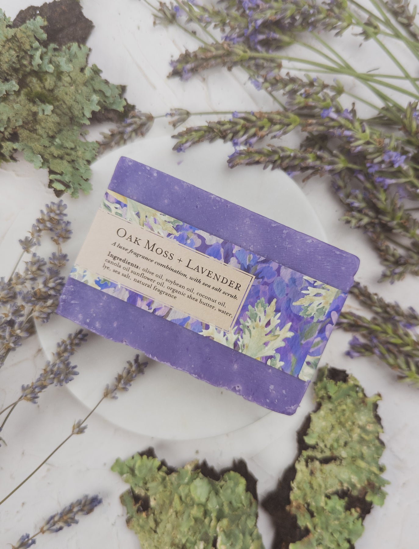 Earthy and herbal, this unique fragrance blend is features soothing lavender and fresh oak moss. Sea salt throughout the bar provides gentle exfoliation.
