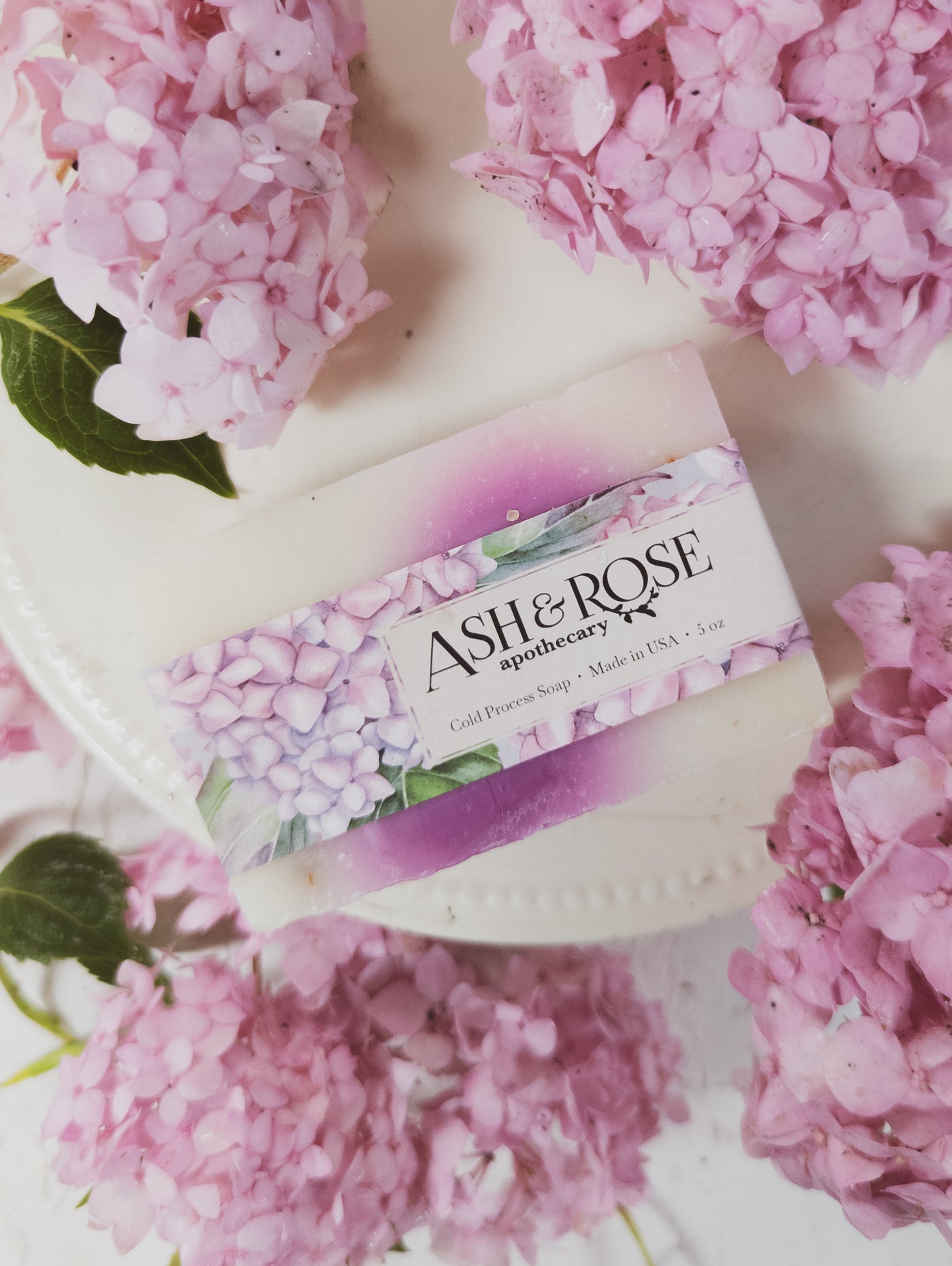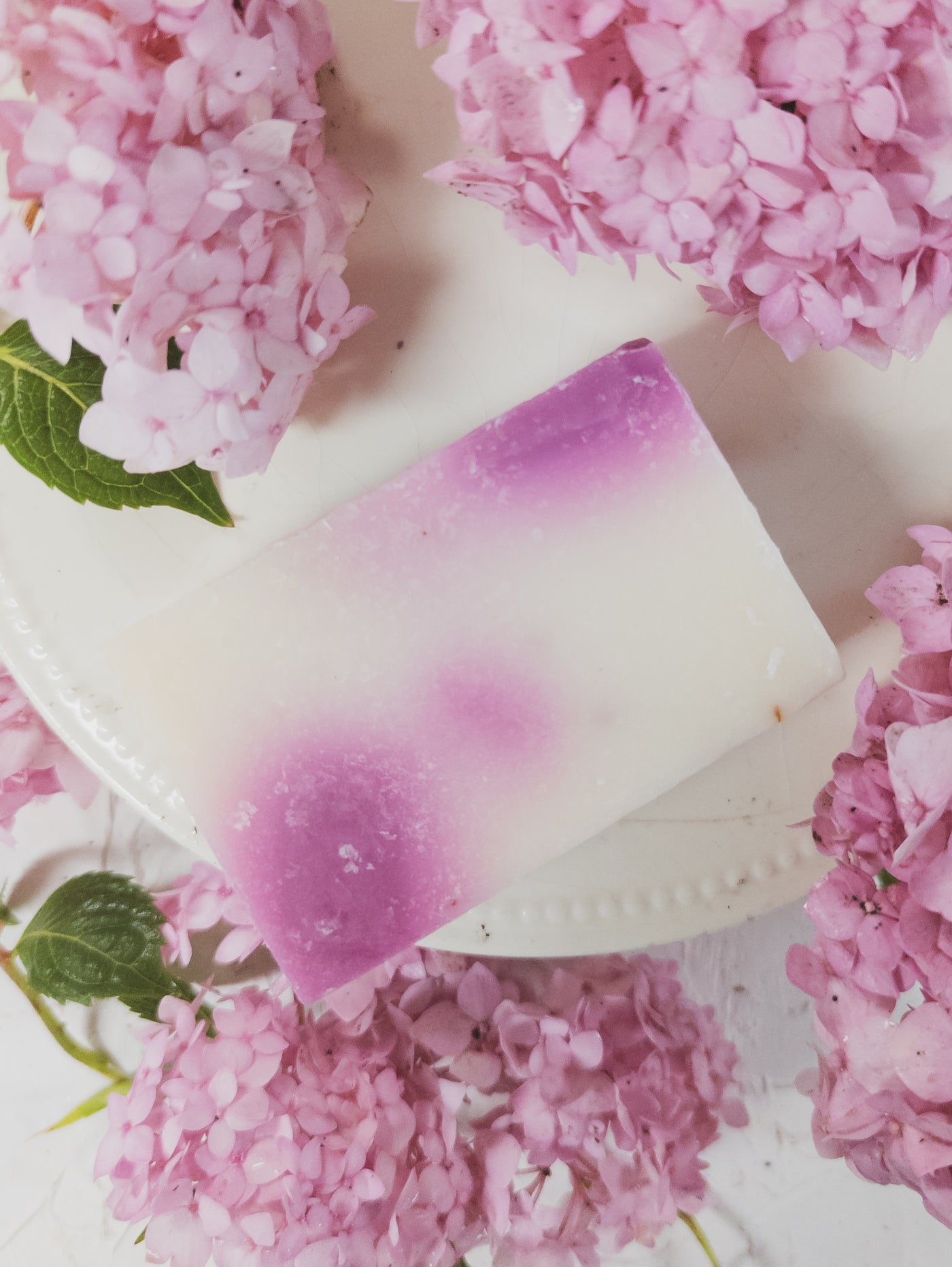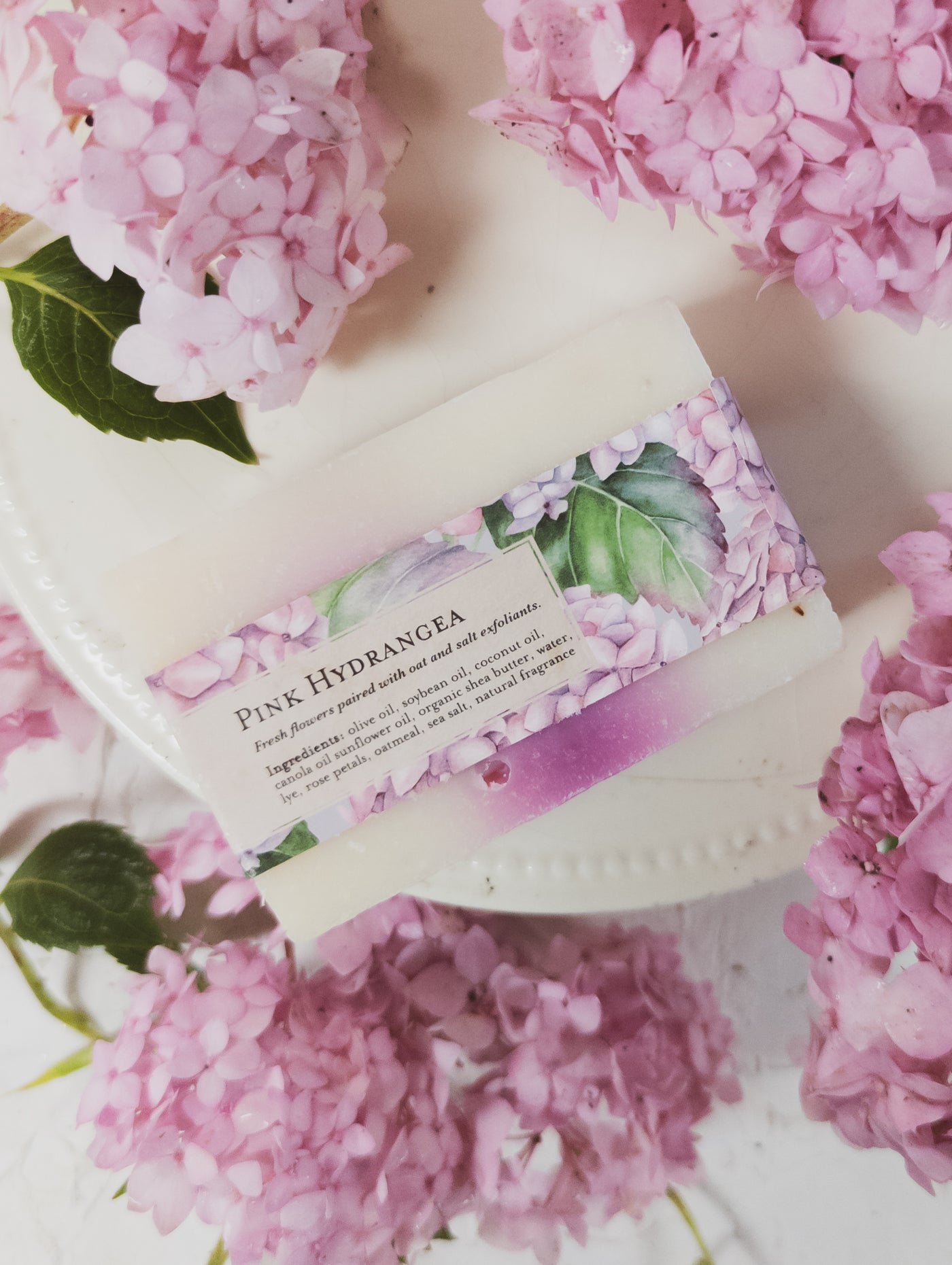 Ingredients: Olive Oil, Soybean Oil, Coconut Oil, Canola Oil, Sunflower Oil, Organic Shea Butter, Water, Sodium Hydroxide (Lye), Sea Salt, Oatmeal, Hydrangea Petals, Natural Fragrance, FD&C Color