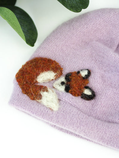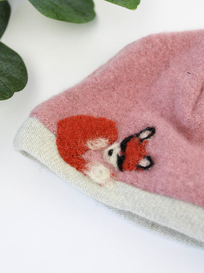 A delightfully warm and soft hat featuring a cute little baby fox, made with hand-appliqued cashmere.