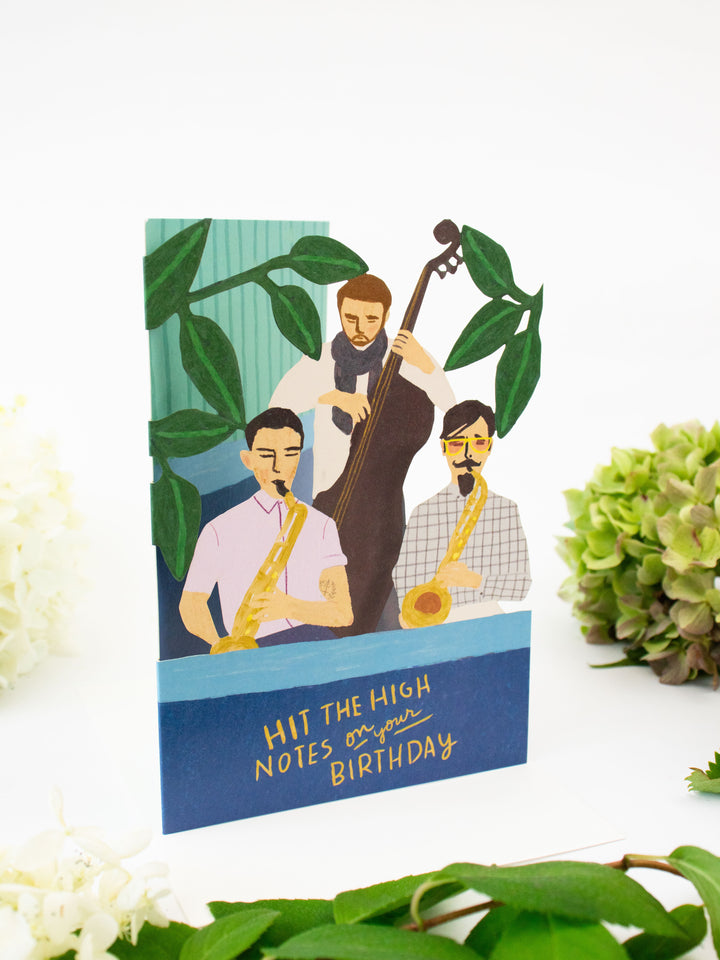 This birthday card shows some cool dudes playing the cello, sax and oboe. Happy Birthday!