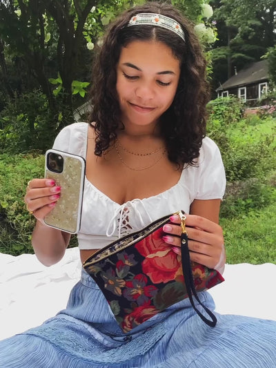 This purse was created from a remnant of fabric from a famous American Designer. It is a sturdy lightweight canvas lined with cotton. Our new detachable cotton twill wristlet strap is included so you can use this as a clutch or wristlet.