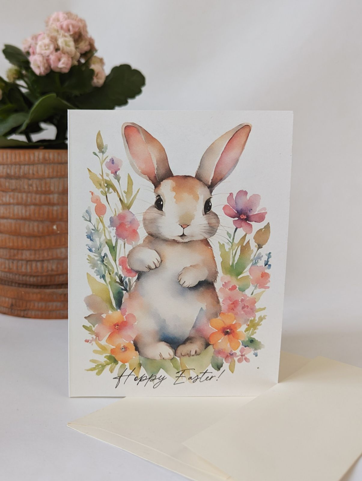 Hop into Easter joy with this adorable card! Featuring a whimsical watercolor bunny frolicking in the garden, this card is the perfect way to send your warm wishes and spread Easter cheer.