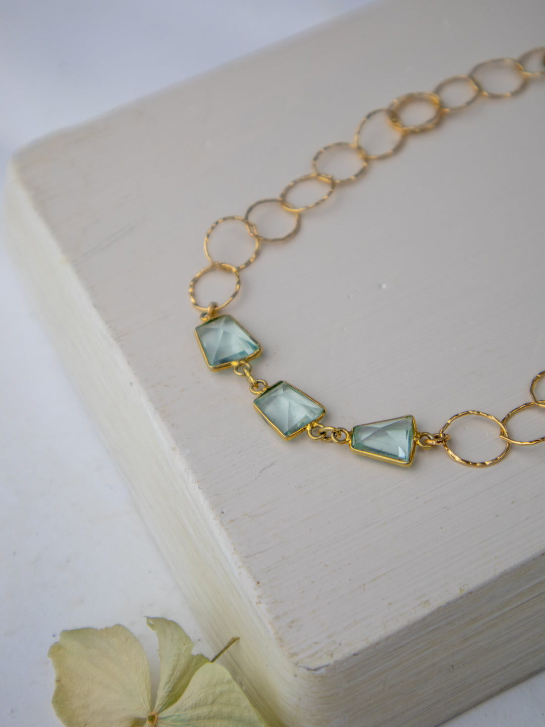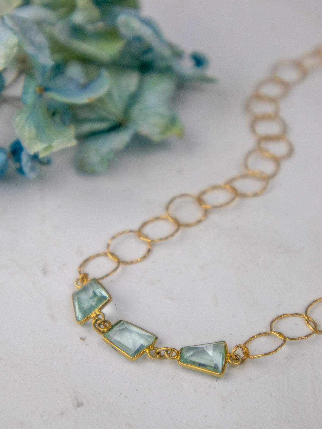 These long necklaces are a celebration of the raw beauty of gemstones. A simple hammered bubble-style chain catches the light and perfectly compliments the bold gemstones. The necklaces are just long enough to pull over your head without a clasp.