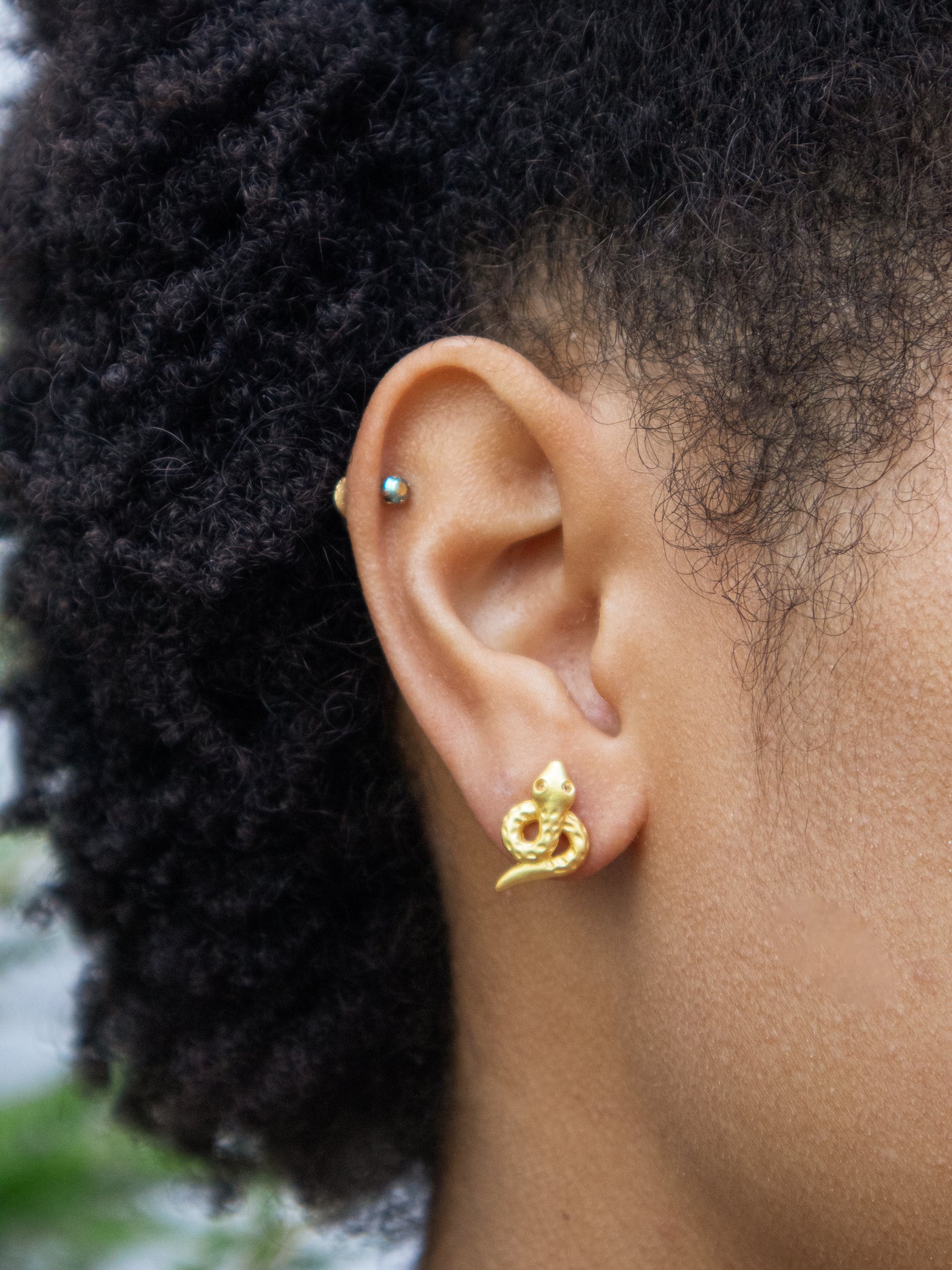 These serpentine studs are an easy shape and size to wear every day. The scale texture and gemstone eyes sparkle in the light.