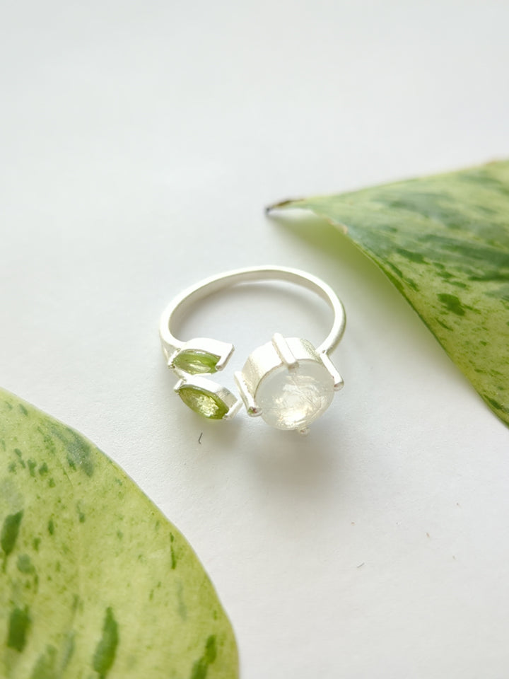 Bold and bright, this statement ring has a unique botanical inspired design, like a flower in bloom. Open front is slightly size adjustable.