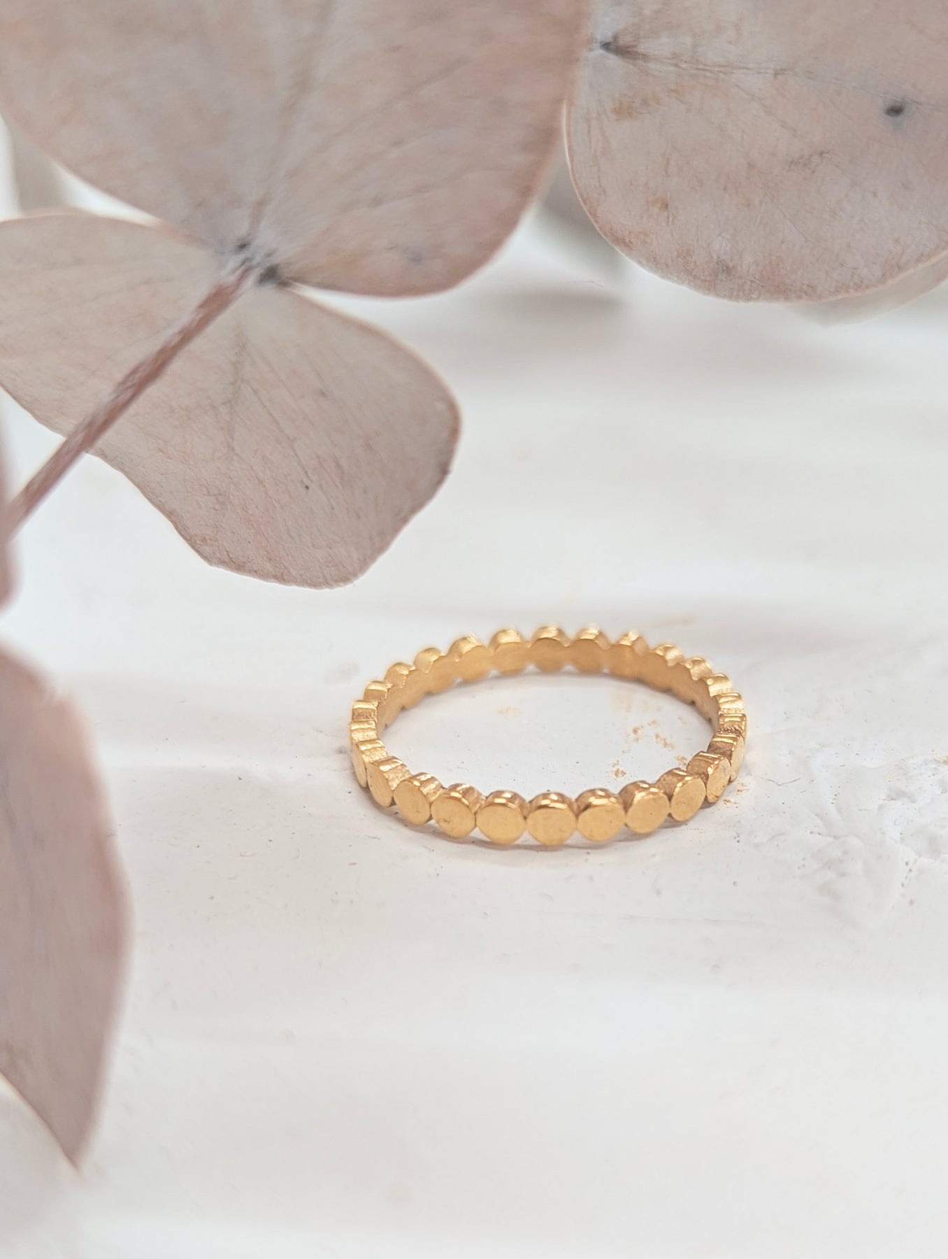 The gentle movement of the repeating circles catches the light just enough to glow, adding subtle texture and softness to your everyday style. Beautiful on its own and effortless to mix and match, this band is a natural choice for creating a layered stack that feels personal, fluid, and uniquely you.