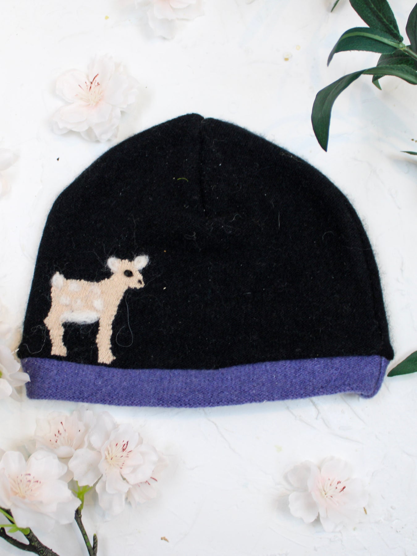 A delightfully warm and soft hat featuring a shy little felted fawn, made with hand-appliqued cashmere. The fawn has a shiny black crystal eye.
