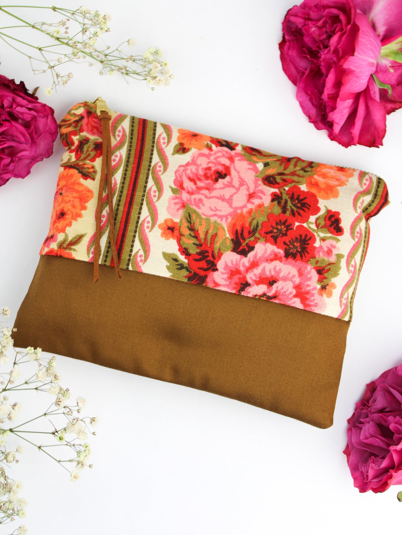 This clutch is charming, but rugged enough for daily use. The outside fabric is a designer upholstery woven with warm roses.