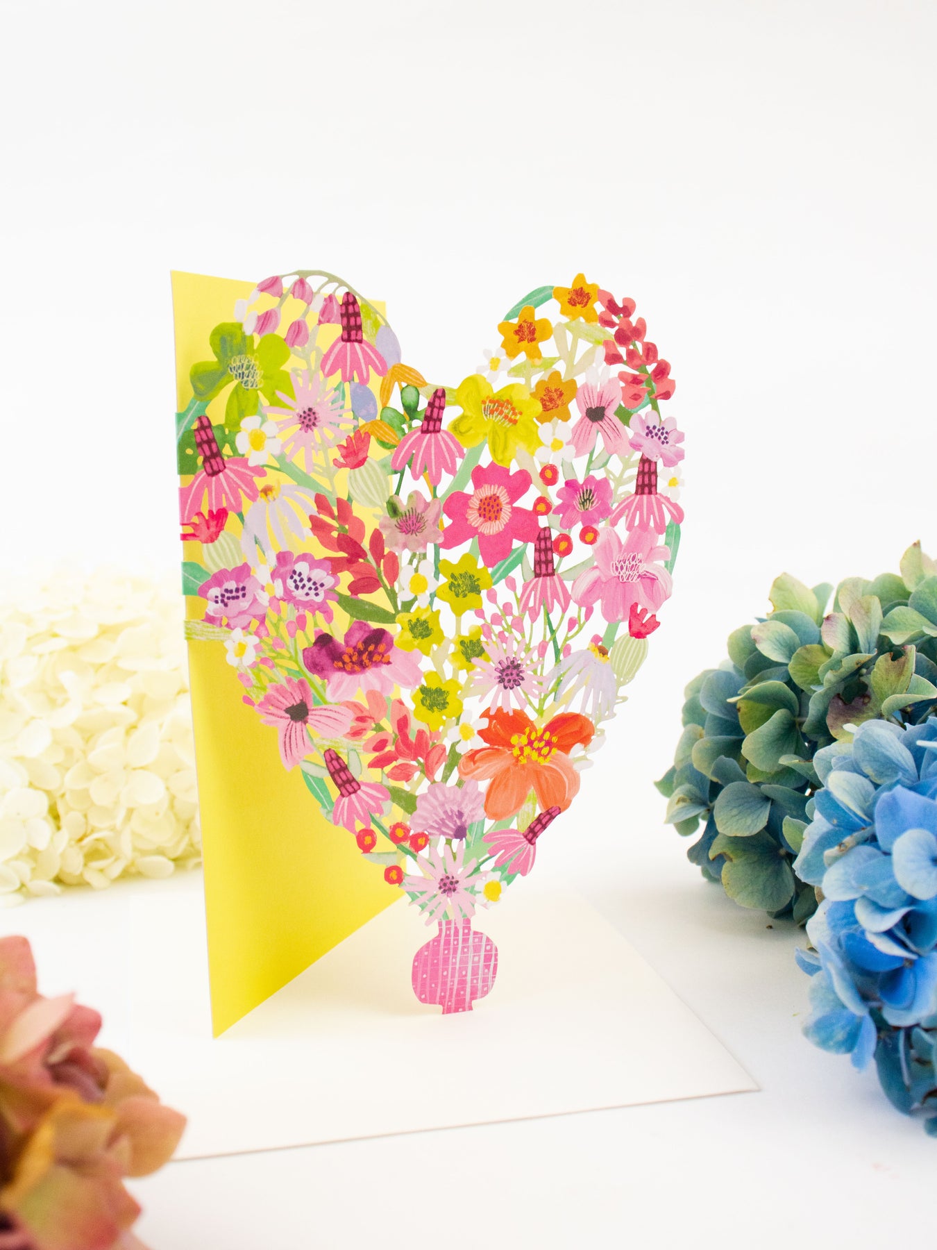 This blank card showcases an exuberant bouquet of mostly pink garden flowers shaped in a heart against a yellow background. What a cheerful message to add to your note!