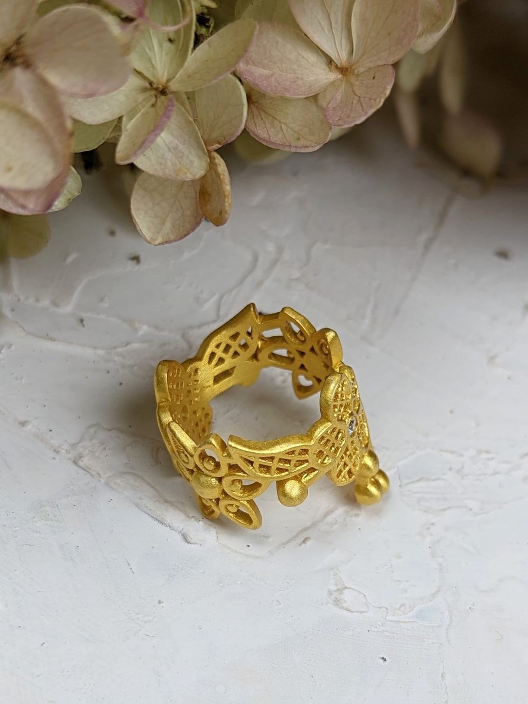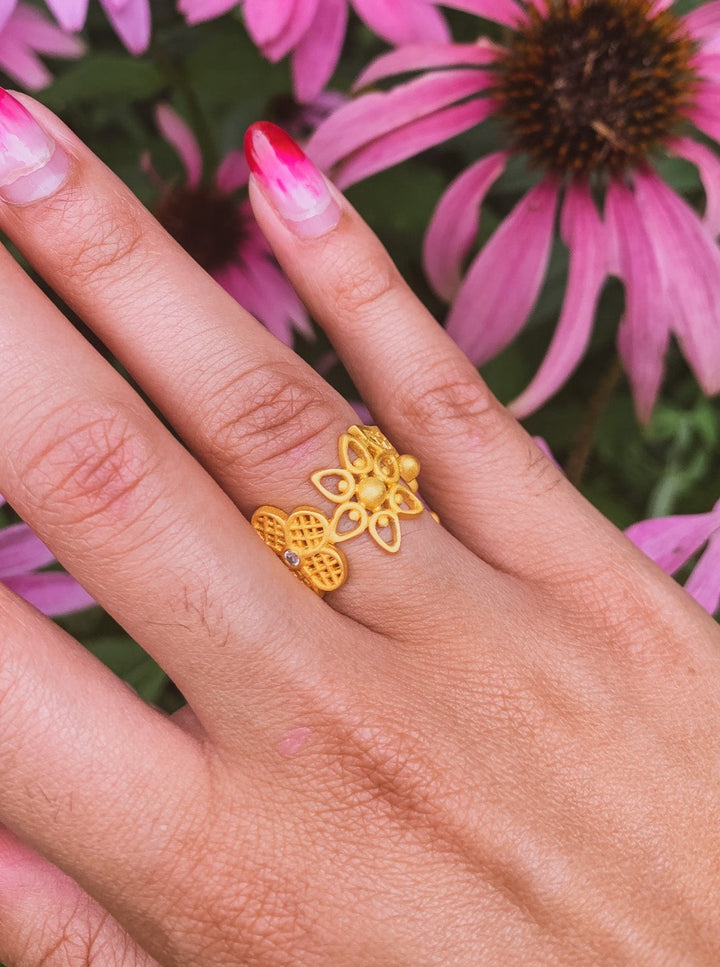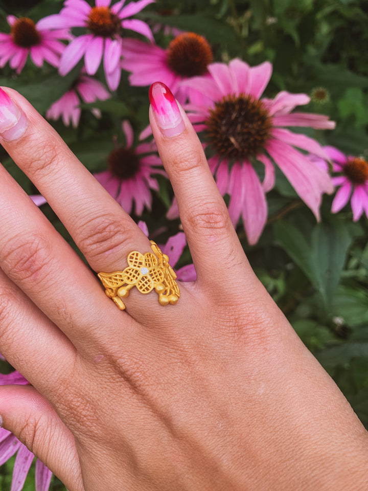 This dramatic oversized ring is intricately details with textured flowers, with a bright gold finish, accented by bright crystal drops.