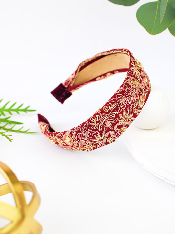 This limited-edition headband is handmade with ornate gold filigree embroidery and a soft vegan suede lining. The ends are capped off with soft velvet ribbon. The quality and rarity of the embroidery make these true hair couture!