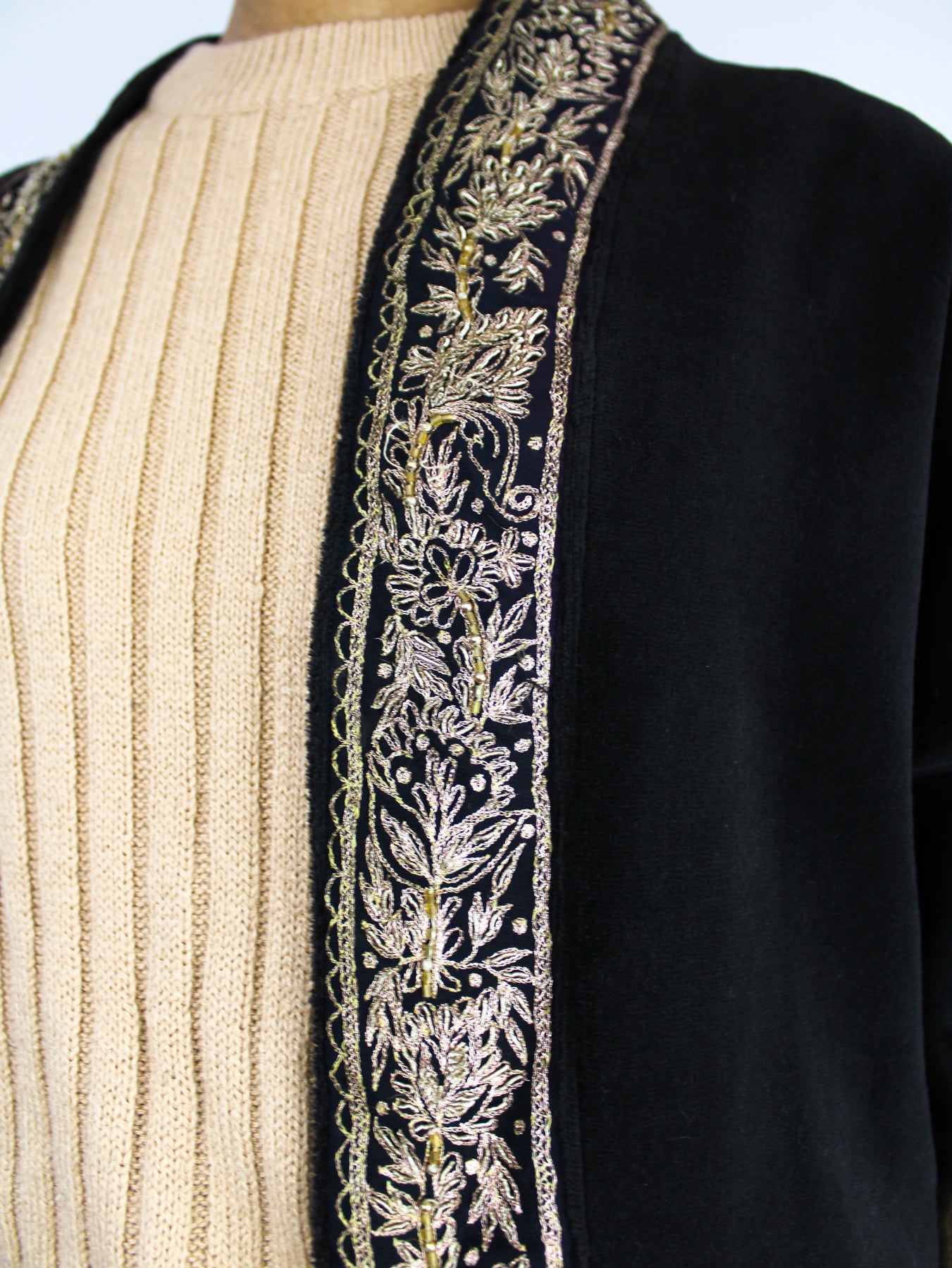 Wrap yourself in timeless elegance with this exquisite short-sleeve black velvet jacket, complete with antique, hand-embroidered goldwork trim.