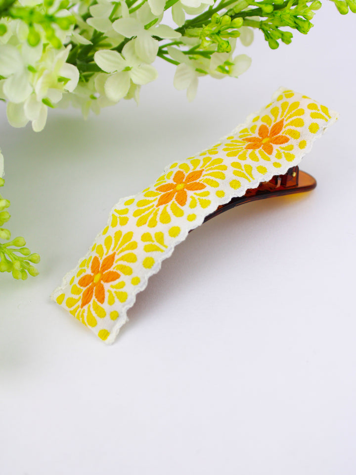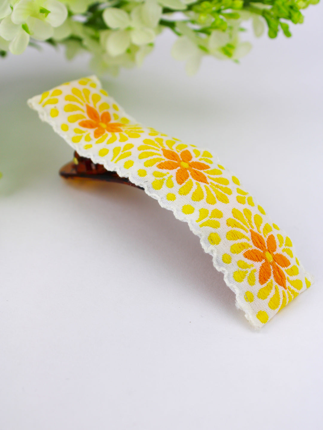 Happy shades of yellow burst against the bright white scalloped cotton fabric. Handmade from authentic vintage woven ribbon.